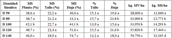 Cuadro 1: Producción de biomasa, materia verde (MV) y materia seca (MS) y proporción de componentes de la planta a distintas densidades de siembra.