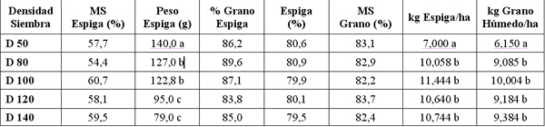 El incremento de la densidad de siembra de maíz para espiga y grano húmedo aumenta significativamente la producción de estos en kg. ha a partir de D 80 y luego se mantiene sin diferencias significativas la producción de grano y espiga al aumentar la cantidad de plantas/ha (p>0,01). El peso de la espiga por el contrario, disminuye significativamente al aumentar la densidad de siembra (p<0,05).